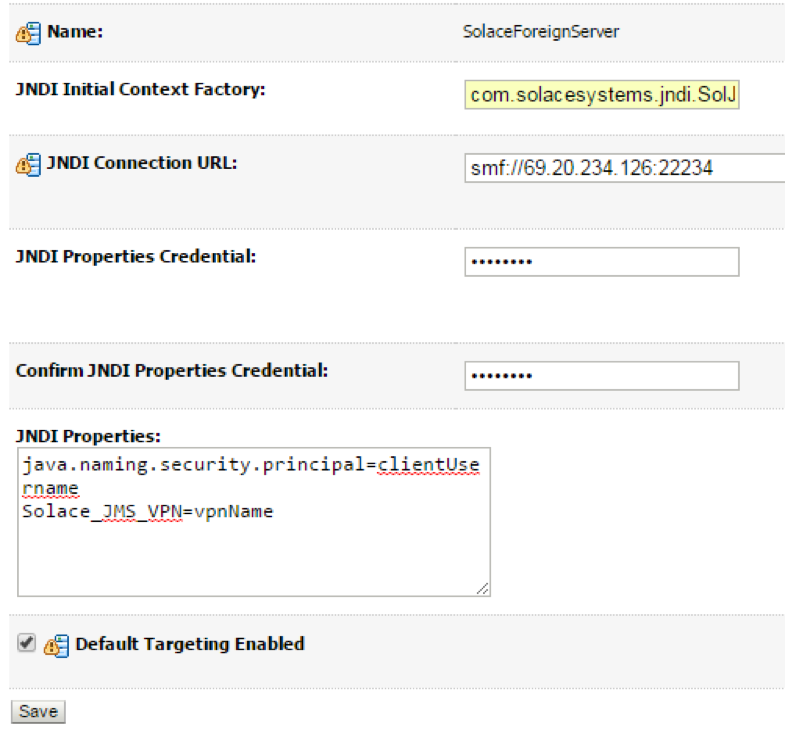 While using Solace as a Foreign Server module, the "ConnectionURL " parameter refered to above maps to "JNDI Connection URL" in the general properties configuration page of the Foreign Server in the WebLogic Administration Console. "ExtendedProps" maps to "JNDI Properties".