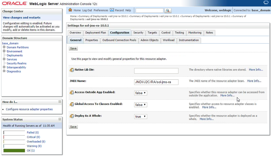 Note this document provides instructions on configuring and deploying the Solace JCA 1.5 resource adapter using the web console application of WebLogic, as well as instructions on configuring Solace as a Foreign JMS Provider Module. For detailed background on either Solace JMS or the WebLogic Application Server refer to the referenced documents below.