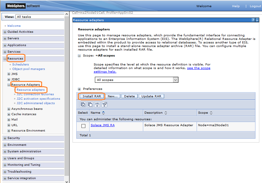 The target audience is developers using the WebSphere Application Server who have general knowledge of both it and JMS. This document focuses on the steps required to integrate the two, and provides instructions on configuring and deploying the Solace JCA 1.5 resource adapter using the web console application of WebSphere. For detailed information on either Solace JMS or the WebSphere Application Server, refer to the documents referenced below.