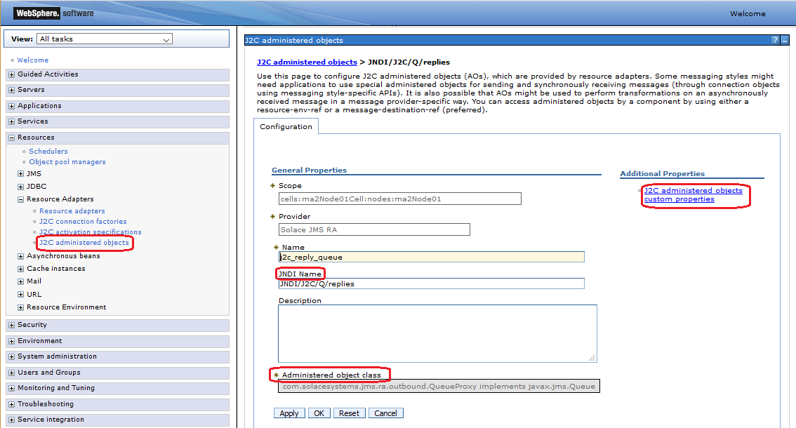 J2C administered object | j2c_reply_queue | JNDI/J2C/Q/replies | A J2C entity used to perform a JNDI lookup of a javax.jms.Queue on the event broker |